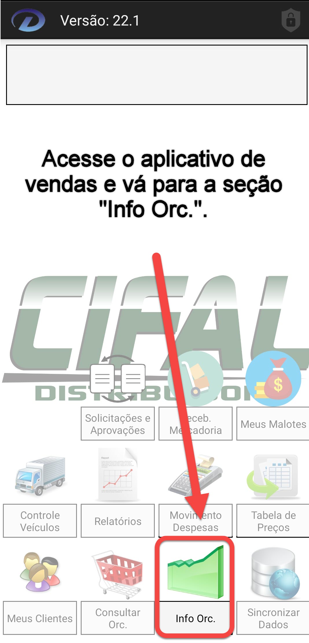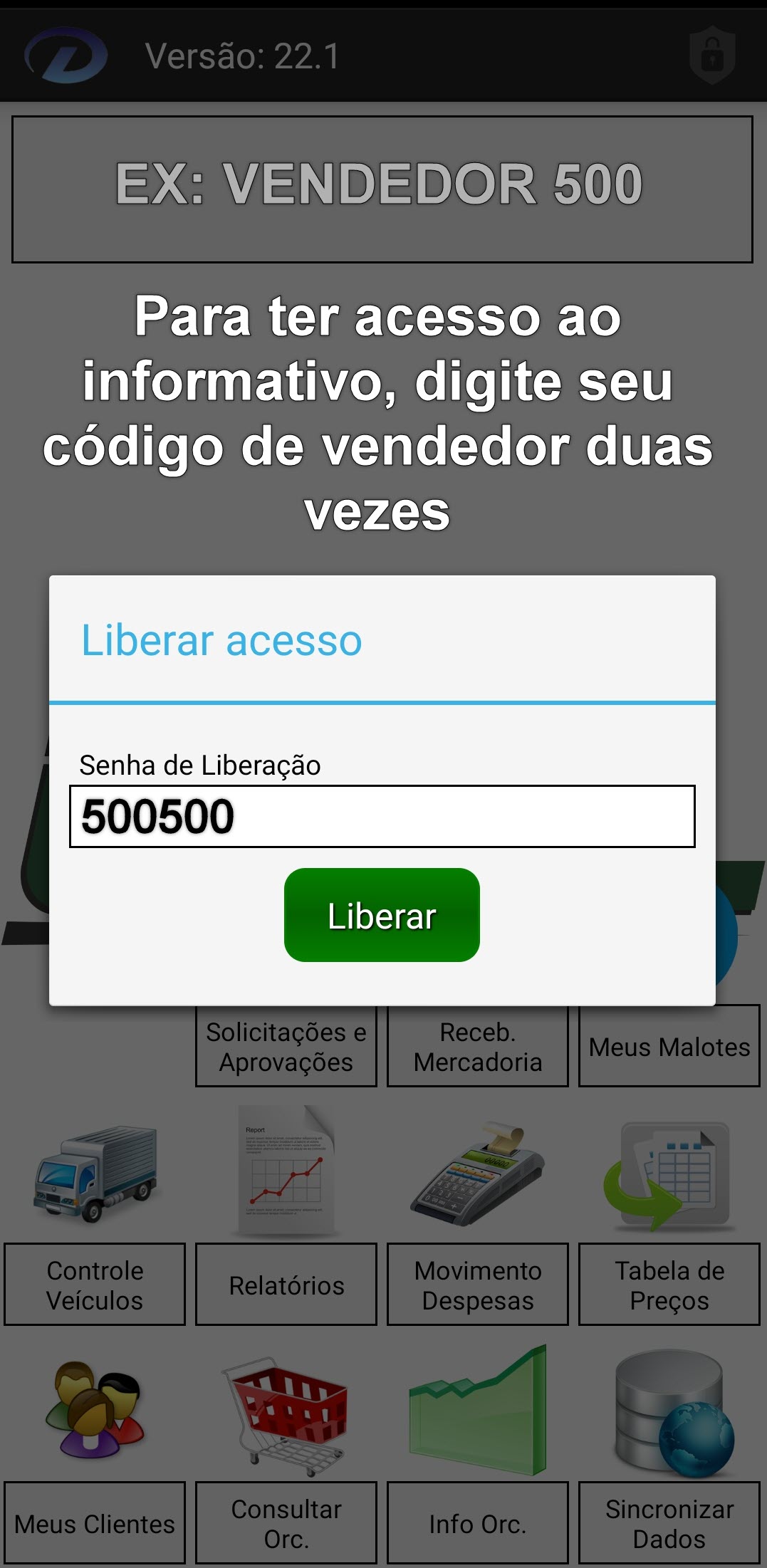 - O aplicativo vai solicitar uma senha de liberação, ela é seu Código de Vendedor duas vezes. ex: a senha do vendedor 500 é 500500.