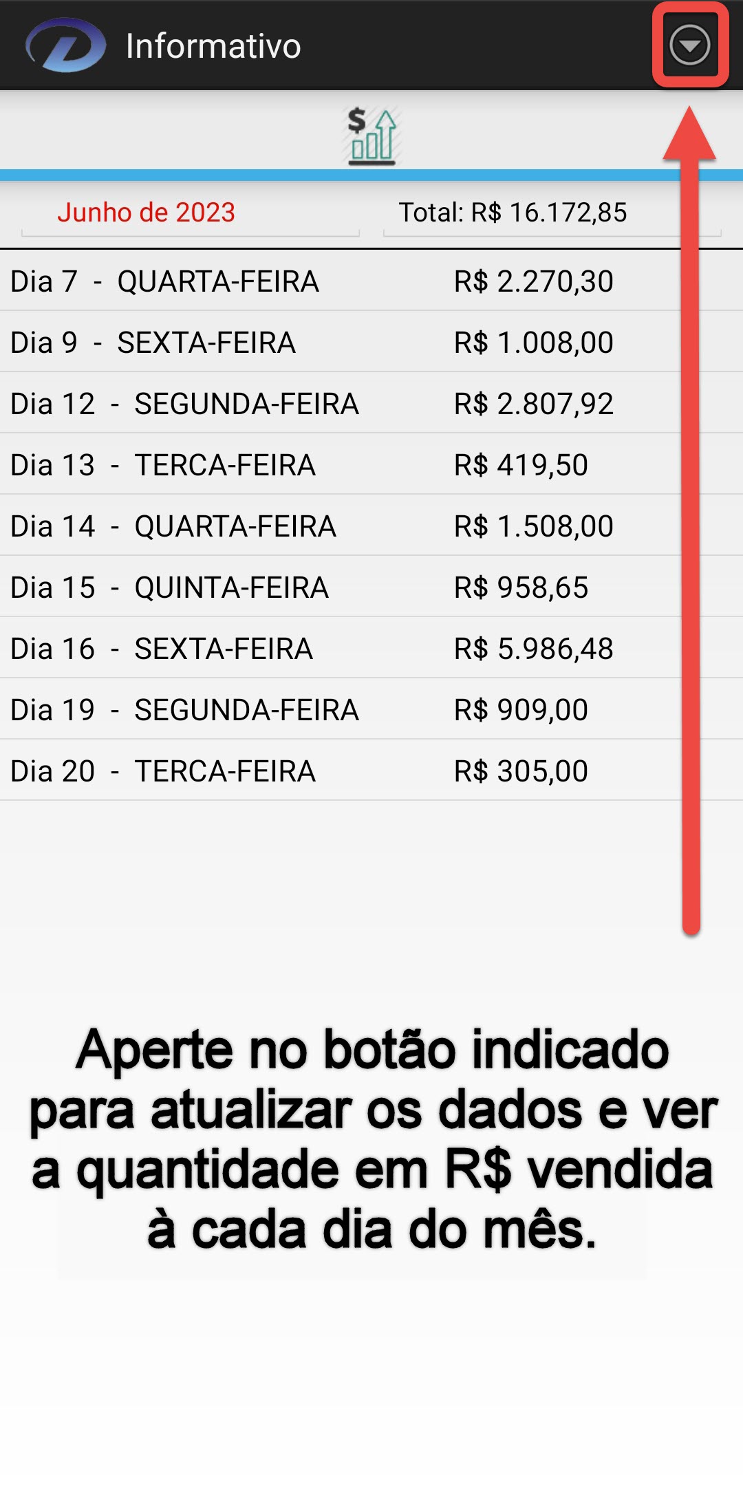 - Aperte no botão indicado para atualizar os dados e ver a quantidade em R$ vendida em cada dia do mês.
