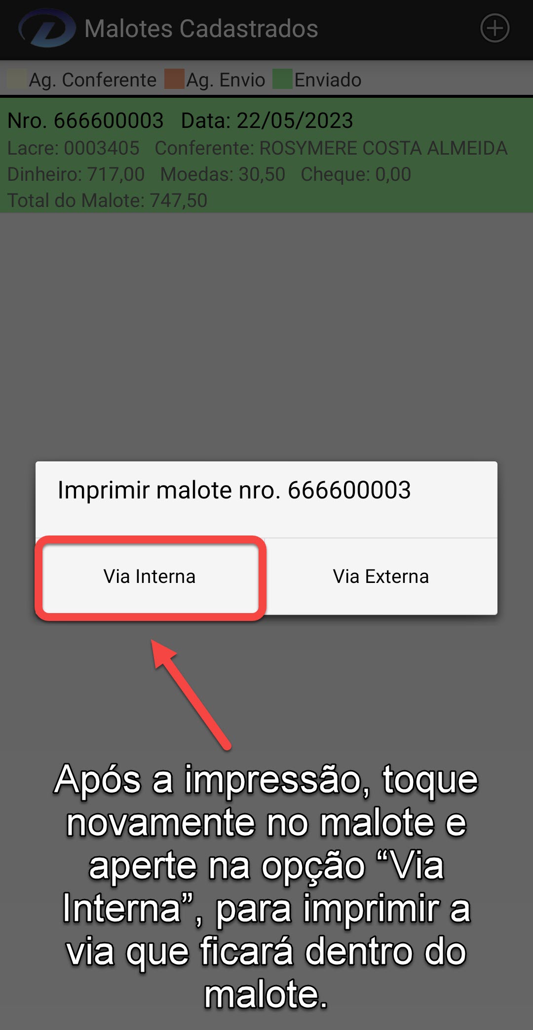 - Após a impressão, toque novamente no malote e aperte na opção “Via Interna”, para imprimir a via que ficará dentro do malote.