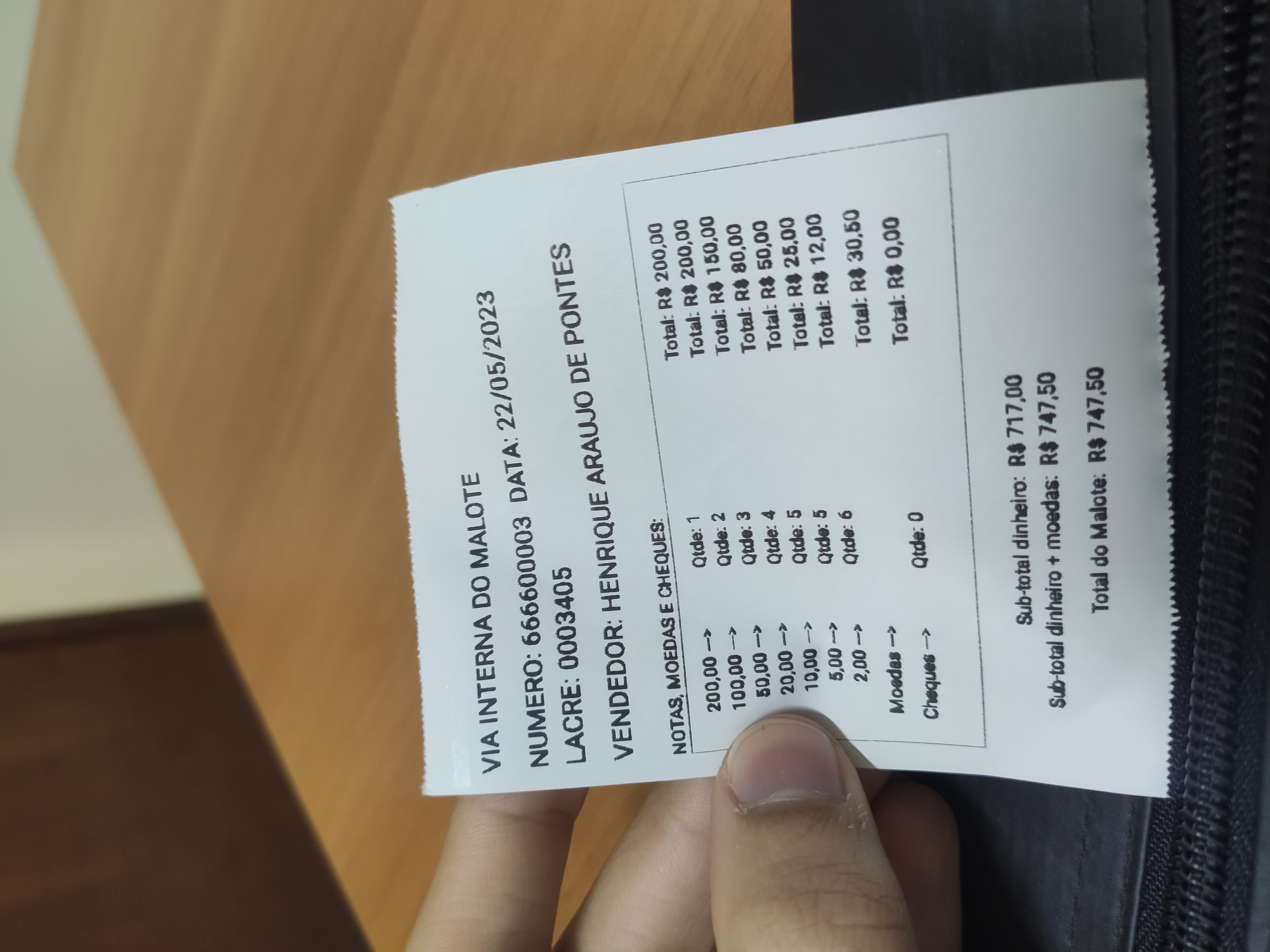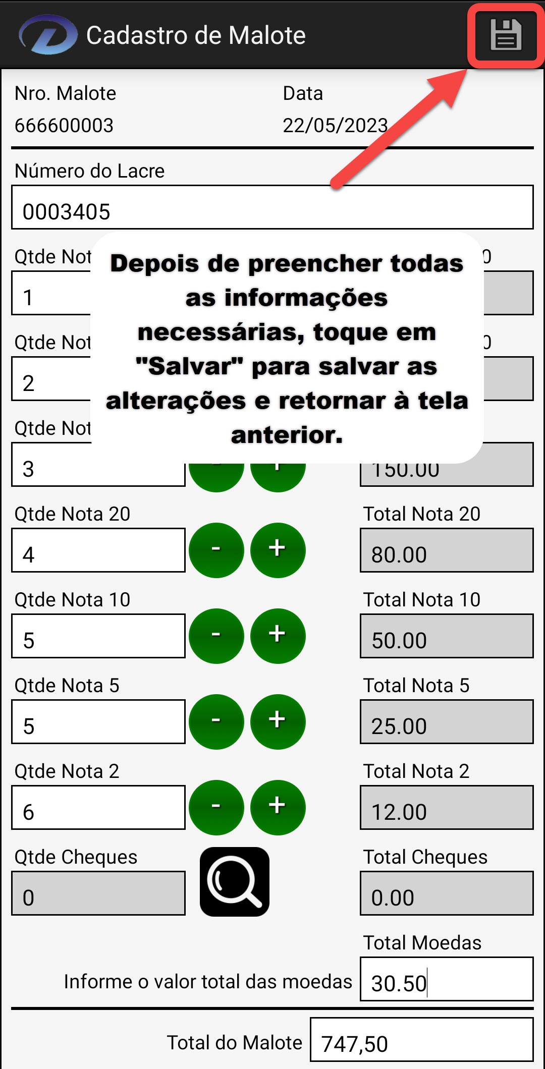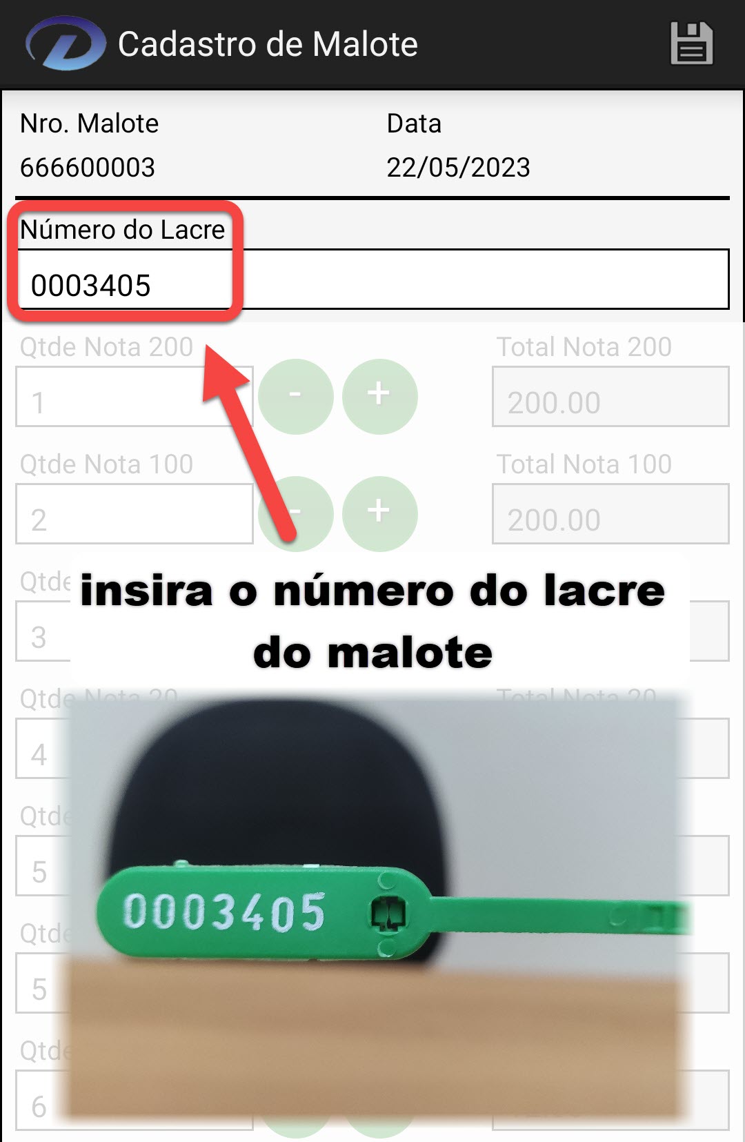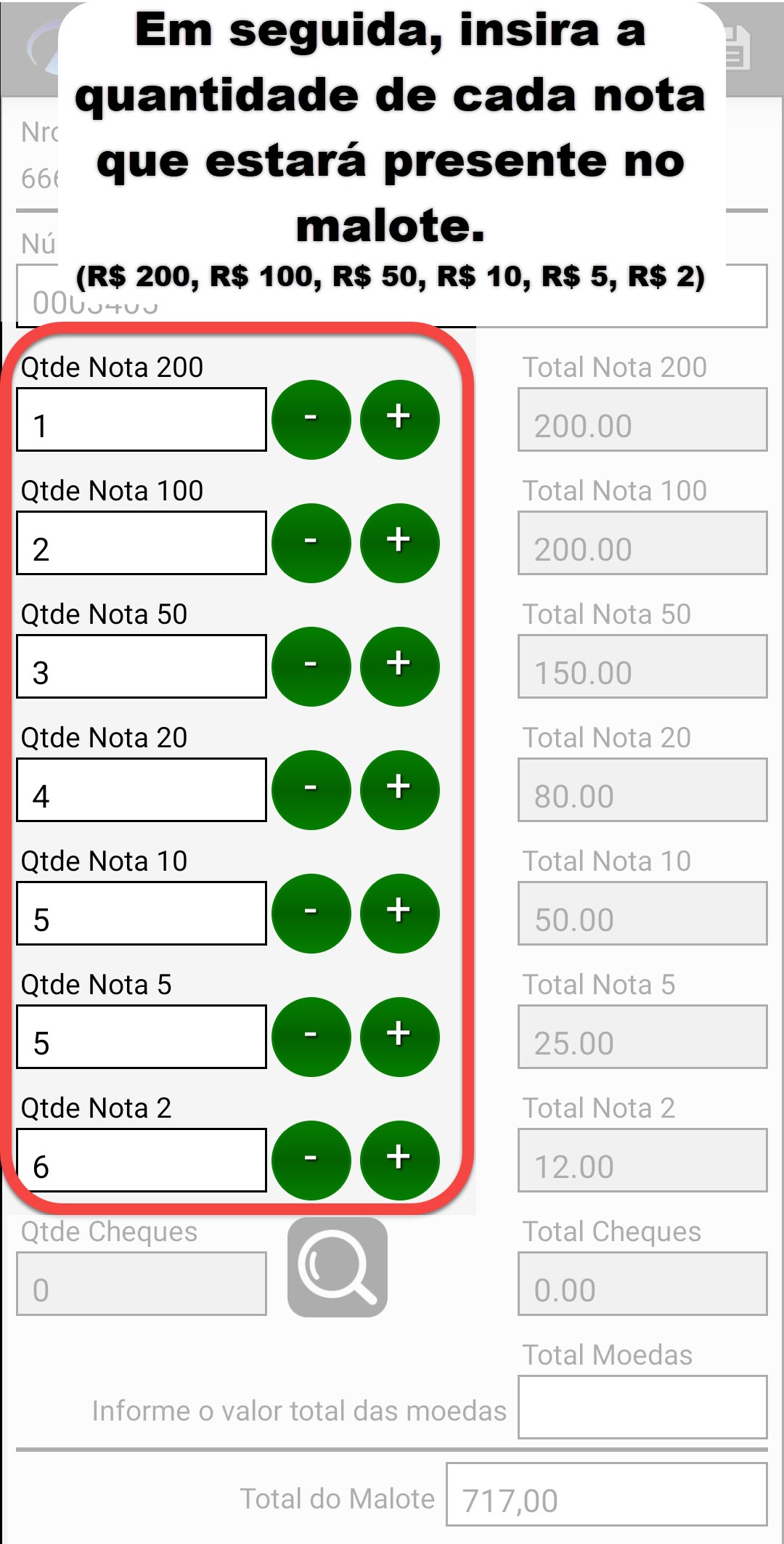 - Em seguida, insira a quantidade de cada nota que estará presente no malote (R$ 200, R$ 100, R$ 50, R$ 10, R$ 5, R$ 2).