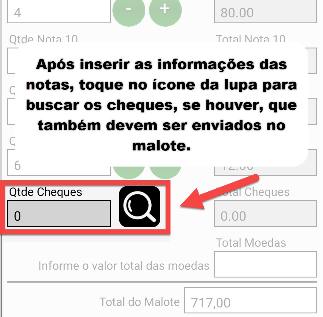 - Após inserir as informações das notas, toque no ícone da lupa para buscar os cheques, se houver, que também devem ser enviados no malote.