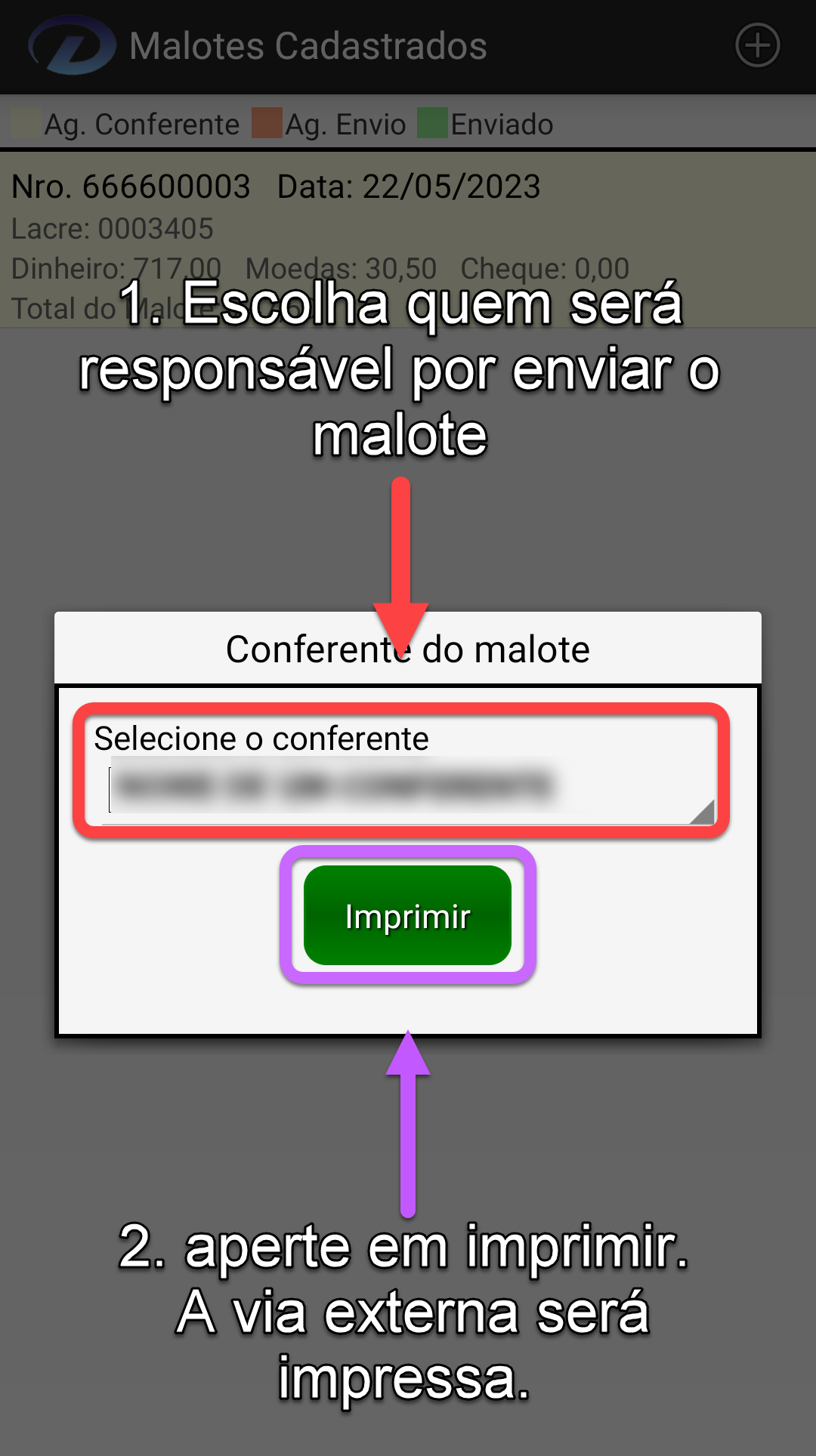 - Escolha quem será responsável por enviar o malote, e aperte em imprimir, a via externa será impressa.